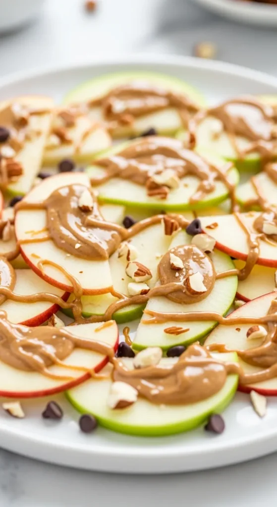 I slice crisp apples and arrange them like chips on a platter. I drizzle warm almond butter and add granola, dark chocolate chips, and shredded coconut.