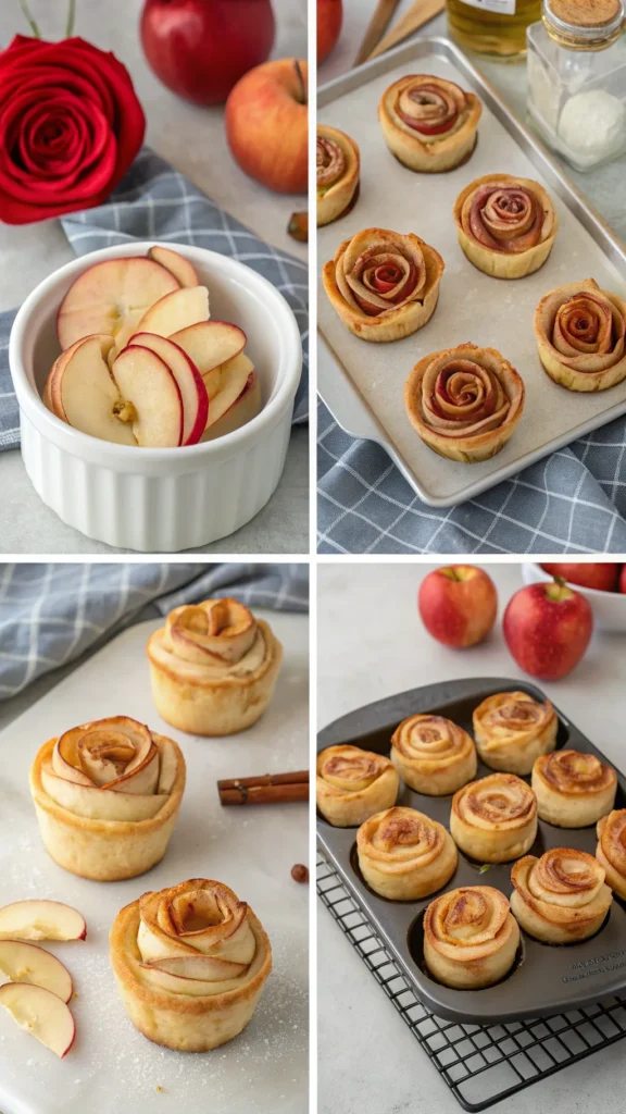 The process looks fancy but feels surprisingly calm once you start. You layer apple slices along pastry strips, roll them gently, and place them upright. That’s where the rose shape appears. I like assembling these slowly and intentionally. It feels more like crafting than baking. Watching the roses bloom in the oven is genuinely satisfying.