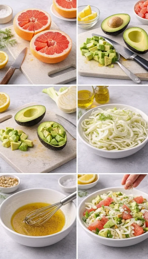 - Assemble. Toss grapefruit, avocado, and fennel in a bowl. Drizzle dressing over the top. Give it a gentle toss no smashing the avocado, please.