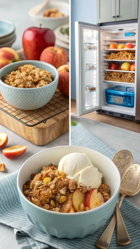 Apple crisp stores well in the fridge for several days. The topping softens slightly, but flavor stays great. Reheating in the oven helps bring back some crunch. Microwaving works, but oven reheating wins for texture.