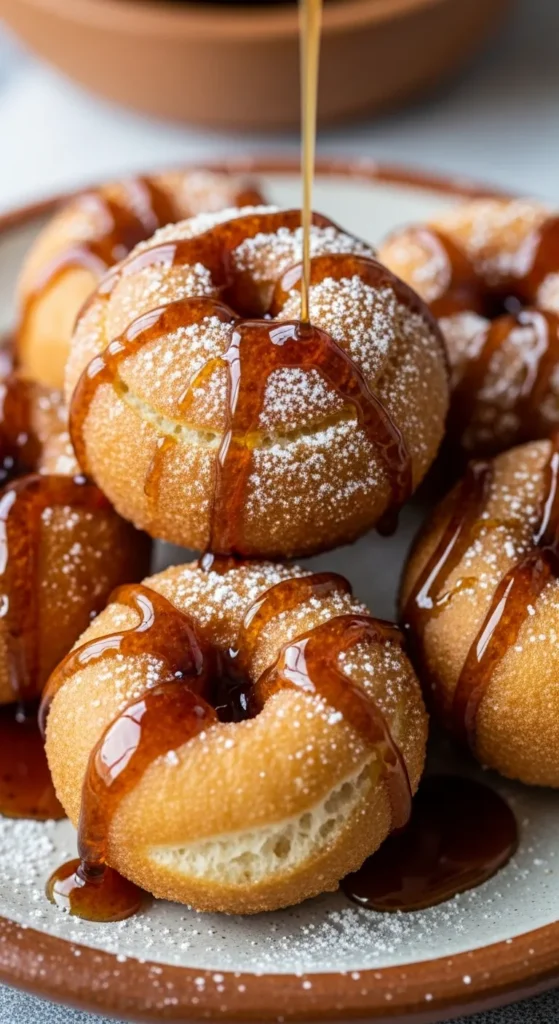 • The Drizzle: Place a crispy buñuelo on a plate and pour a generous amount of warm syrup over the top.