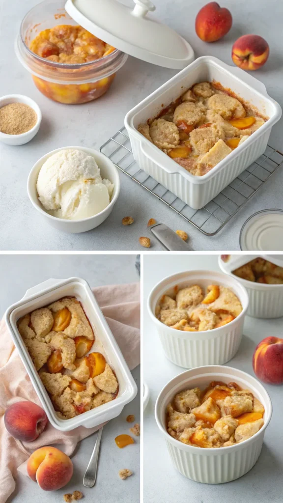 Greek yogurt peach cobbler stores surprisingly well. The topping stays soft even after chilling. I actually like it the next day too. Just cover it properly and refrigerate. Microwaving works, FYI, but oven reheating tastes better.