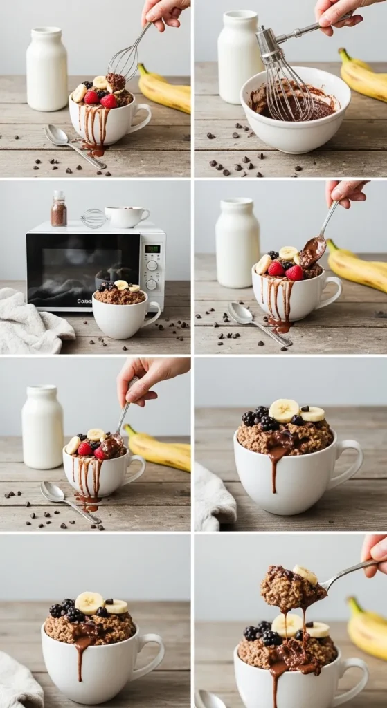 - Mix it up – Grab a small microwave-safe mug or bowl. Toss in oats, cocoa powder, and salt. Stir like you mean it.