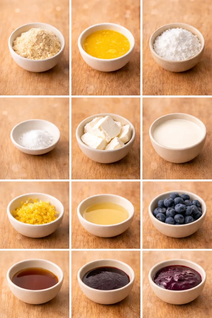 Toss blueberries, lemon juice, and sweetener into a small saucepan. Simmer for 5–7 minutes until the berries burst and things get jammy. Smash lightly with a spoon, then let it cool. - Make the cheesecake filling.