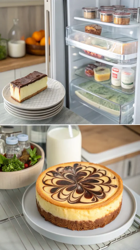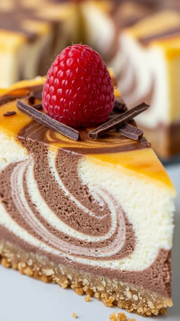 Bake at 325°F (160°C) for 50–60 minutes until the edges are set and the center slightly jiggles. Remove from the oven and let it cool at room temperature. Chill in the refrigerator for at least 4–6 hours, preferably overnight, to allow the flavors to meld and the cheesecake to firm up. Proper chilling is essential for clean slices and a creamy texture. It also allows the marble pattern to set beautifully.