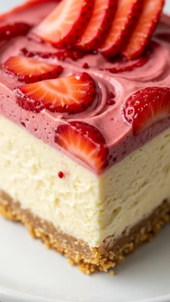 Serve the cheesecake chilled, topped with fresh strawberries, sugar-free whipped cream, or a strawberry puree. Slice carefully with a hot knife for clean, professional-looking pieces. This cheesecake is perfect for celebrations or a decadent treat any day.