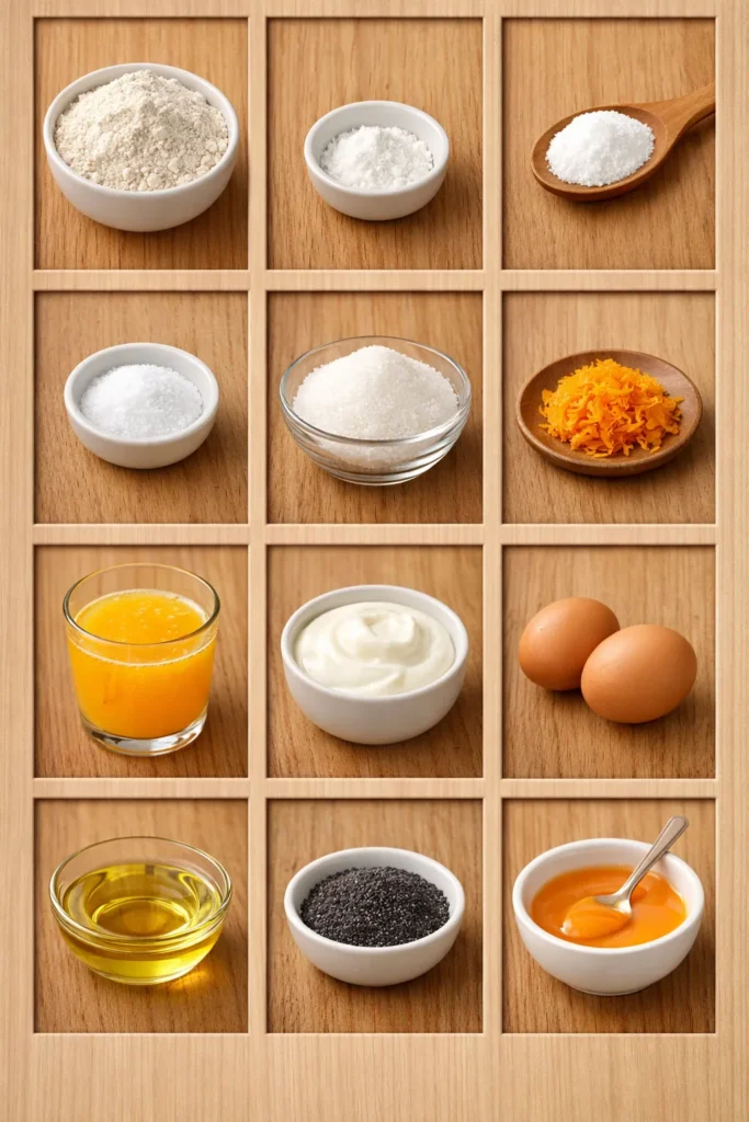 - Mix dry stuff: In a large bowl, whisk together flour, baking powder, baking soda, salt, sugar, and poppy seeds. Set aside.