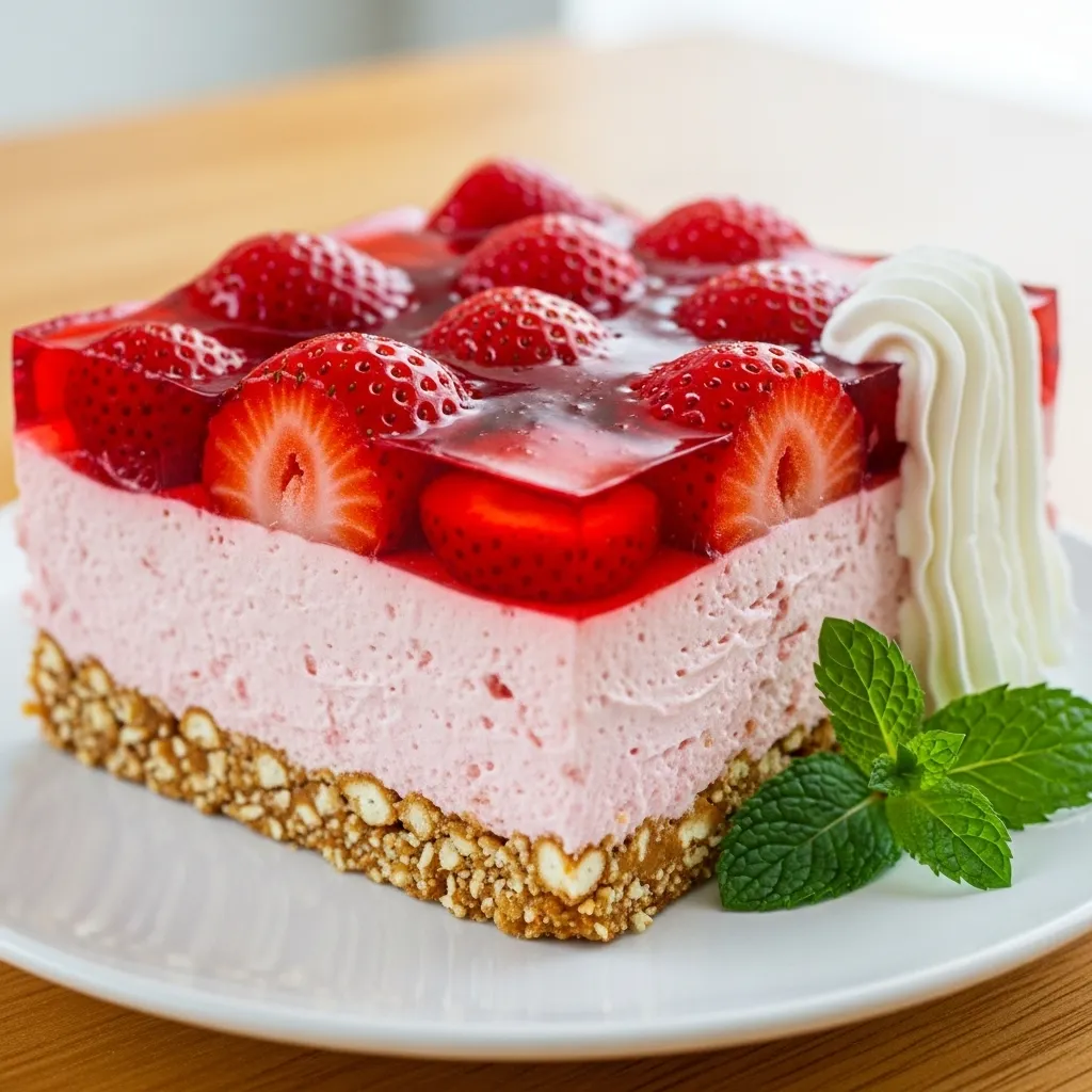 Store this dessert covered in the refrigerator, not the freezer. Freezing ruins the texture and turns the gelatin watery once thawed. It stays fresh for about 2–3 days. After that, the pretzels soften too much. Still edible, but not ideal.