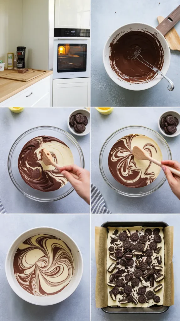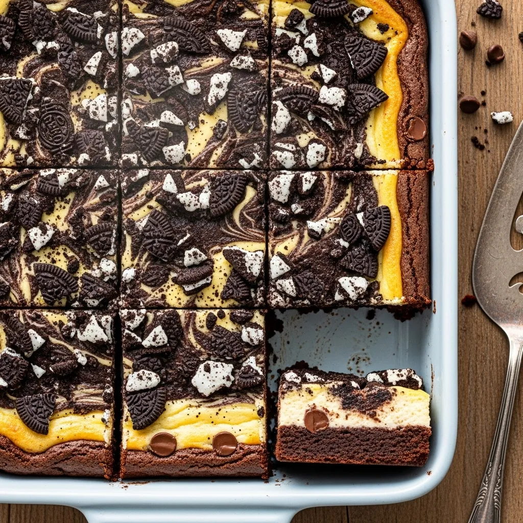 Use a knife or skewer and gently swirl everything together. Don’t overdo it this is brownies, not abstract art. - Add the Oreos.