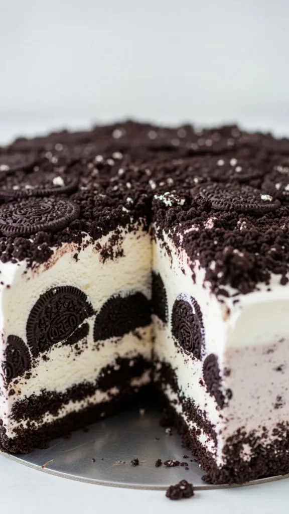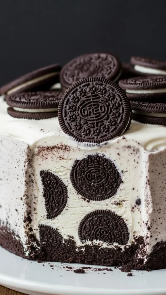 The ingredients are simple, but quality still matters. Full-fat ice cream creates a creamier texture and holds its shape better when frozen. Oreos provide both flavor and crunch, so crushing them evenly helps maintain balance throughout the cake.