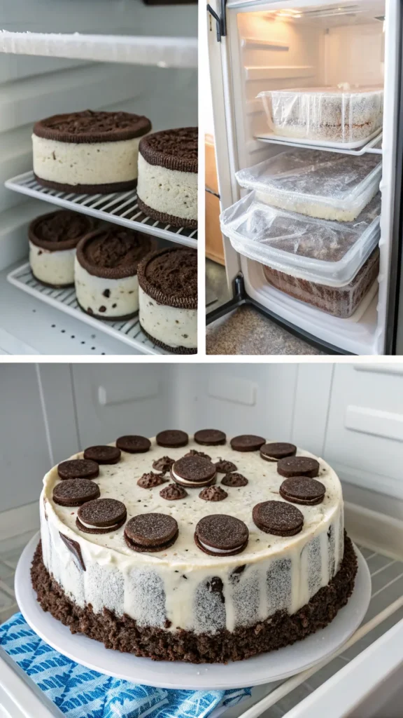 Proper storage keeps this cake tasting fresh and creamy. Always store it covered to prevent freezer burn and unwanted odors. An airtight container or tightly wrapped foil works best. If stored correctly, Oreo Ice Cream Cake holds its texture and flavor for several days. Individual slices freeze well, making it easy to enjoy later without thawing the entire cake.