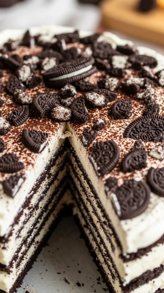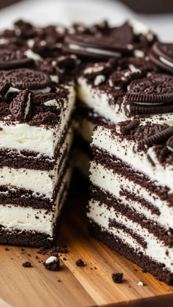 This cake works because it relies on layers and chilling rather than baking. The Oreos soften slightly as they absorb moisture from the whipped cream, creating a cake-like texture. The contrast between crunchy cookie edges and soft, creamy layers is pure indulgence. Another reason it succeeds is its flexibility. You can use regular Oreos, flavored Oreos, or even gluten-free options. Adding chocolate drizzle, fudge, or even sliced bananas between layers enhances the flavor without complicating the recipe.