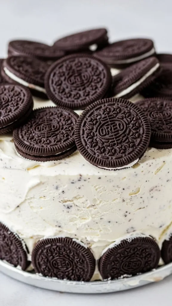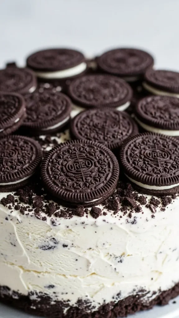 Serve this cake straight from the freezer, letting it sit out for about five minutes before slicing. This short rest softens the ice cream just enough to make cutting easier. Using a knife dipped in warm water helps create clean, professional-looking slices. This cake doesn’t need much on the side, but whipped cream or extra Oreo crumbs on top add visual appeal. Cold milk or iced coffee pairs especially well and balances the sweetness nicely.