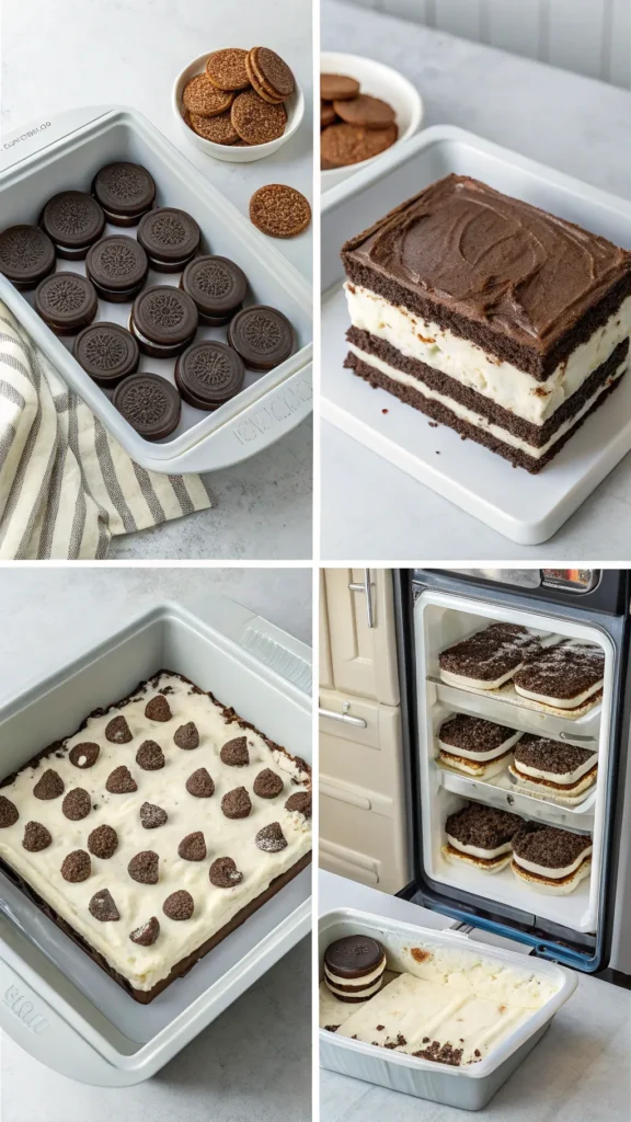 This cake is easy to customize without breaking the recipe. Swap vanilla ice cream for cookies and cream, chocolate, or mint chocolate chip. Each option keeps the Oreo flavor front and center while adding variety. You can also add layers of fudge sauce, caramel, or peanut butter. Just keep additions thin so the cake stays stable and easy to slice.
