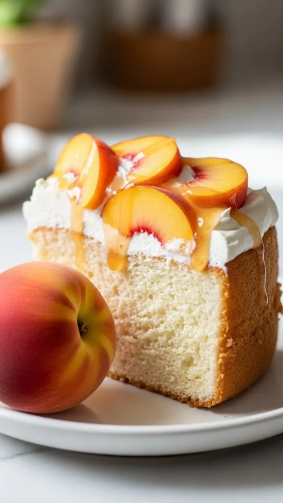 Peach Angel Food Cake relies on quality ingredients for flavor and texture. Fresh, firm peaches work best because they hold their shape when folded into the cake. Overripe peaches can release too much liquid and make the cake soggy.