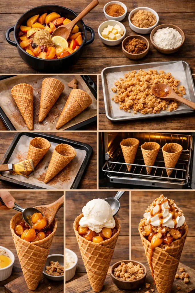 First of all, it’s peach cobbler. That already puts it in elite dessert territory. Now imagine stuffing that into a crunchy waffle cone with a scoop of vanilla ice cream melting into the warm peaches. Hot meets cold. Soft meets crunchy. You win.