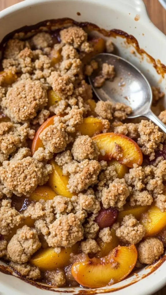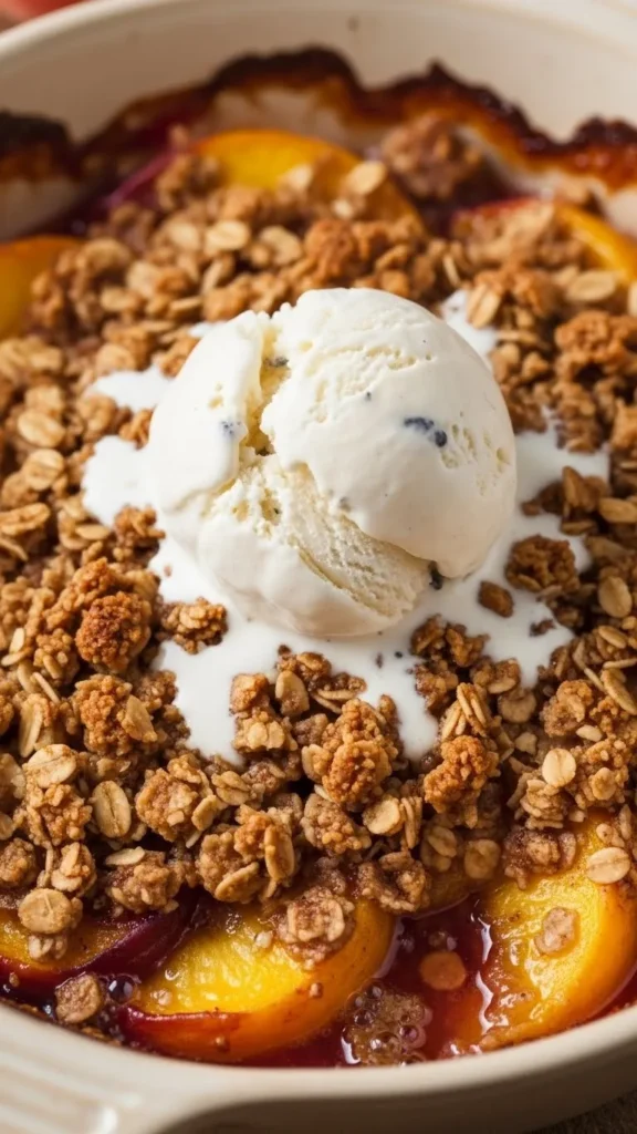 Let the peach crisp rest for 10–15 minutes before serving. This allows the filling to set slightly while remaining warm and juicy.
