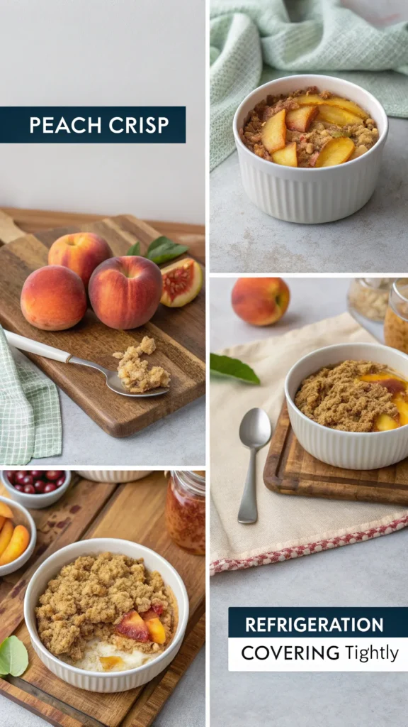 Peach crisp stores well, but the topping softens over time. Cover it tightly and refrigerate leftovers. A quick reheat brings some crunch back. I reheat it in the oven when possible.
