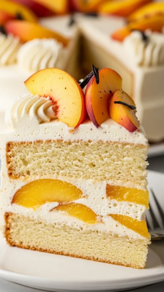 Peach Vanilla Cake is easy to adapt. Add cinnamon or nutmeg for a warm flavor twist, or fold in blueberries for color and tartness. You can also try a peach glaze or vanilla glaze drizzled on top for extra sweetness. Vegan or dairy-free versions work well with plant-based butter and milk alternatives. The peaches maintain their juicy, fresh flavor, and the cake remains soft and tender.