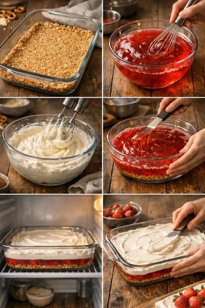 - Layer it up: Pour the slightly cooled Jello over the baked crust. Don’t panic if it looks liquidy that’s normal. Spread your cream cheese mixture over the top gently. You want it pretty, not messy (but let’s be real, messy is sometimes fun too).