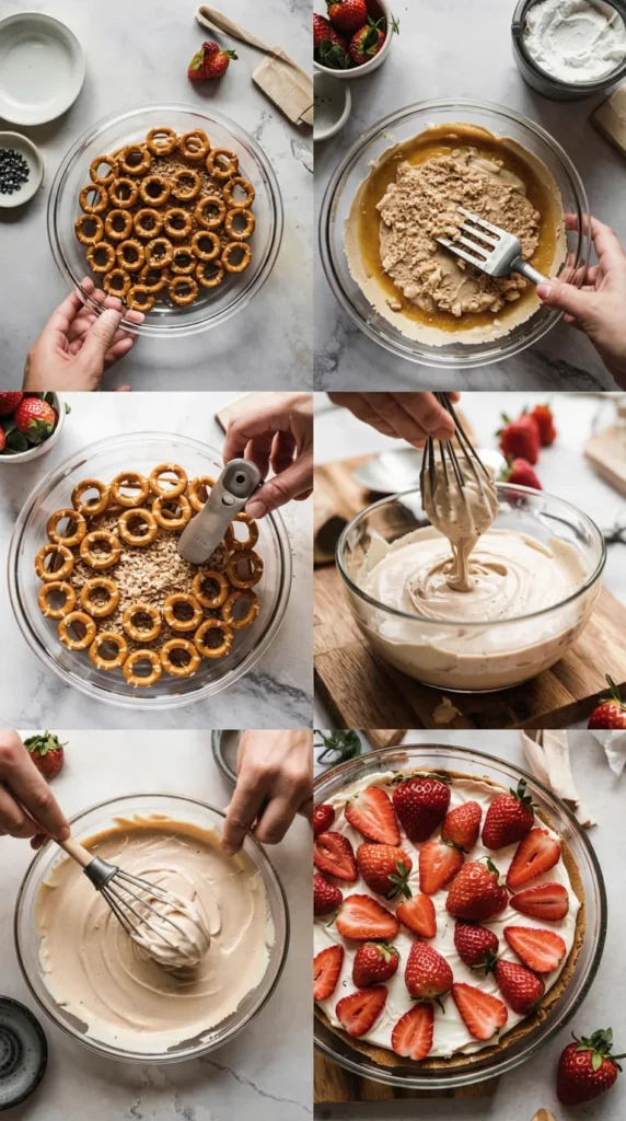 Crush the pretzels (don’t pulverize, unless you like sand). Mix with 1/2 cup sugar and melted butter. Press into a 9×13-inch baking dish. Pro tip: Press firmly. You want a base that holds up, not a crumbly disaster.