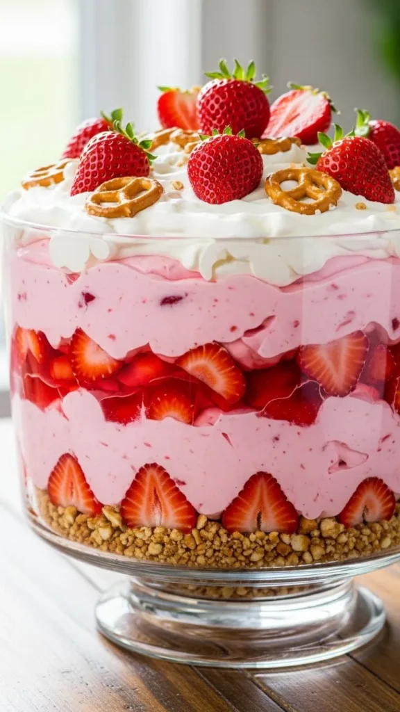 This dessert shines when served cold. I like using clear bowls so people can see the strawberry bits and pretzel crunch. Presentation stays casual, and that’s the charm. It works great as a scoopable dessert. No knives, no perfect cuts, no stress.