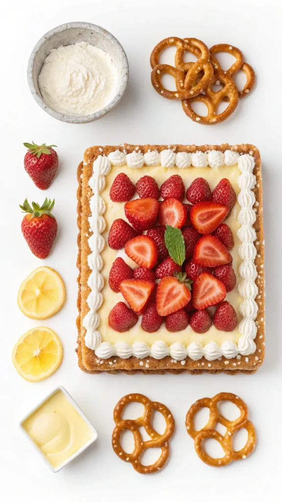 Strawberry pretzel icebox dessert succeeds because each layer knows its role. Skip one or rush the process, and the balance falls apart. When done right, every bite feels intentional. I think of this dessert as structured comfort food. It feels nostalgic but still polished.