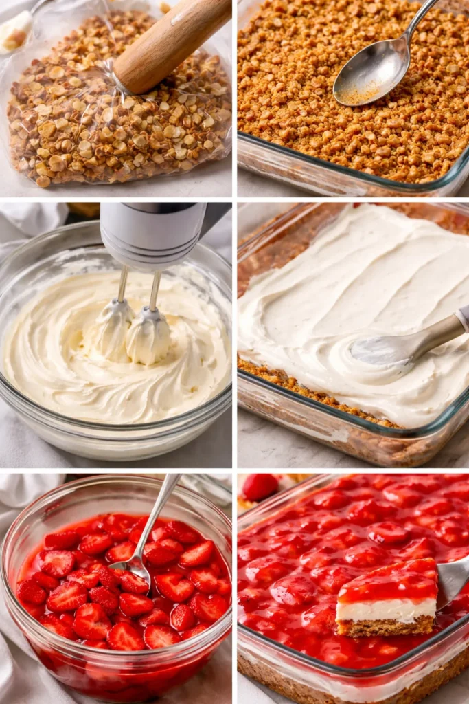 Dissolve the strawberry Jello in boiling water. Let it cool slightly, then stir in the strawberries. Don’t rush this step or you’ll melt the cream layer. And no one wants that drama.