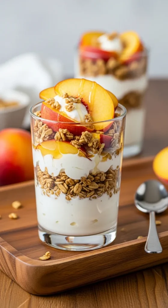 Looking for a dessert that’s cute, customizable, and doesn’t require baking? Enter the peach parfait. Layers of fresh peaches, yogurt, granola, and a drizzle of honey = pure bliss.