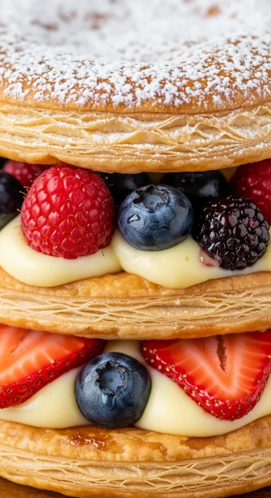 Making these layers is surprisingly easy, it’s mostly assembly, a little patience, and some careful layering. Once your puff pastry is baked and your vanilla cream is ready, it’s just a matter of stacking, spreading, and topping with berries. Every step is rewarding, and the end result looks like a dessert straight from a bakery!