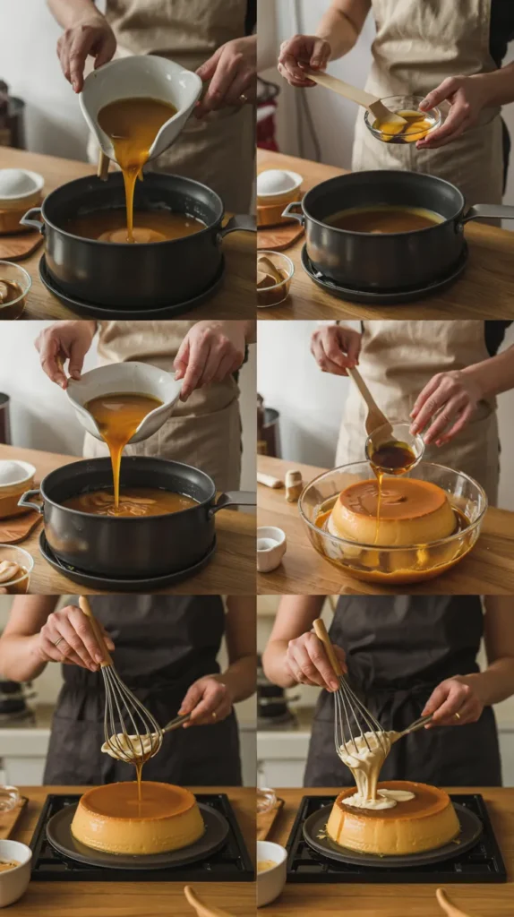 Add sugar and water to a saucepan over medium heat. Don’t stir like a maniac just swirl the pan gently. Watch closely until it turns golden amber. The second it smells nutty, pull it off the heat. Burnt caramel is a personal tragedy. - Pour caramel into your pan.