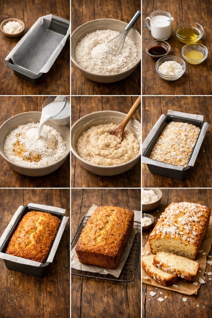 Transfer the batter into your loaf pan. Smooth the top and, if you’re feeling extra, sprinkle coconut flakes on top. - Bake for 45–55 minutes.
